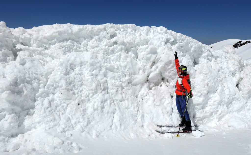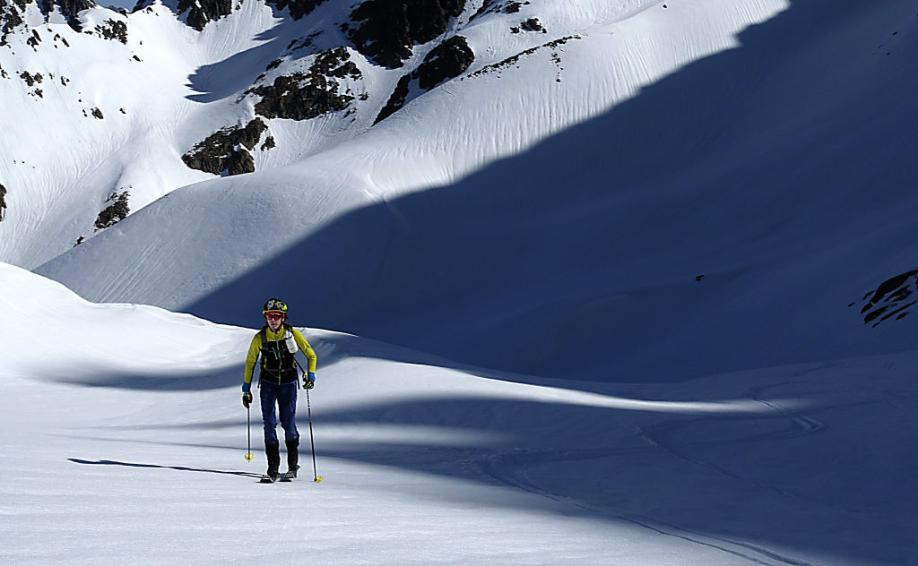 Auf skitour.fr entdecken wir einen Eintrag zu einer Tour bei Pinsot und wir erhoffen uns nochmals gute Bedingungen. 200Hm tragen, dann weiter durch einen massiven Lawinenstrich, etwas fauler Schnee, aber schließlich doch durchgefroren. Kurzfristig entscheiden wir uns für das Col de la Valloire, ich fahre südseitig noch 350hm ab bis der Schnee bremst und dann geht es gutgelaunt über feinsten Firn zusammen wieder zurück. Ich filme Lenzi in der Abfahrt mit der GoPro und komme kaum hinterher – schaut super aus auf dem Schnee und in der Landschaft, die großen Schwünge. Nicht so jedoch im Film: Der Objektivdeckel deckelt noch auf dem Objektiv und macht seinem Namen alle Ehre: 12 Minuten tiefschwarzes Bild mit Knirschen der Skikanten. Na bravo 😉